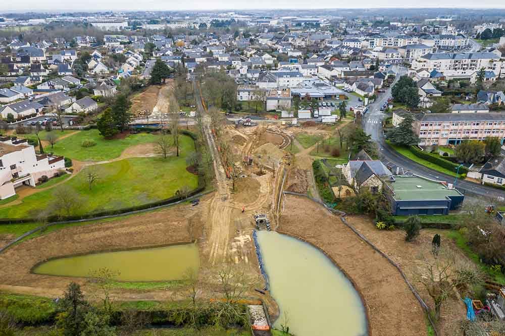 L’objectif est de créer un espace d’agrément propice à la biodiversité dans un cadre urbain. Angers Loire Métropole souhaitait y créer un bassin pour protéger cet écosystème, il était donc indispensable de traiter les eaux pluviales qui avaient pu être polluées avant d’alimenter cette retenue d’eau. Tout l’enjeu consistait alors à s’adapter au réseau d’assainissement existant, en nappes phréatiques et avec très peu de foncier disponible.